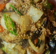 - 재료: 돼지고기(다짐육), 가지, 양파, 고추장, 설탕, 간장